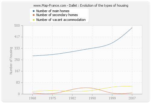 The following graphs show the history of the number and the type of housing of Dallet from 1968 to 2007. The second graph is drawn in cubic interpolation. This allows to obtain more exactly the number of accommodation of the town of Dallet years where no inventory was made.
