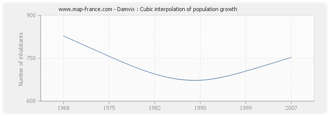 This curve shows the history of the population of Damvix from 1968 to 2007 in cubic interpolation. This provides more precisely the population of the municipality of Damvix the years where no census has been taken.