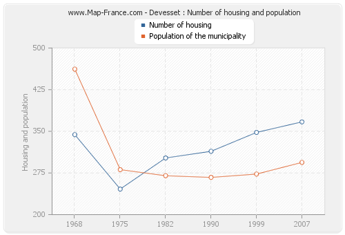 The population of Devesset was 294 inhabitants in 2007, 273 inhabitants in 1999, 267 inhabitants in 1990, 270 inhabitants in 1982, 281 inhabitants in 1975 and 462 inhabitants in 1968. Meanwhile, the number of housing of Devesset was 367 in 2007, 348 in 1999, 314 in 1990, 302 in 1982, 246 in 1975 and 344 in 1968.