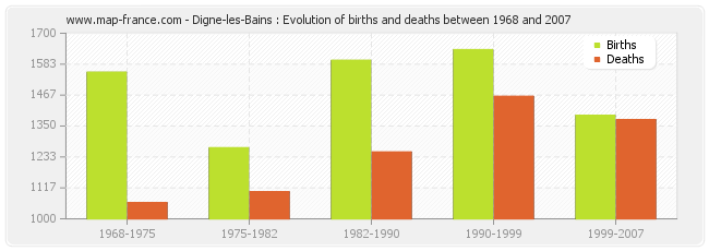 Digne-les-Bains : evolution of births and deaths from 1968 to 2007