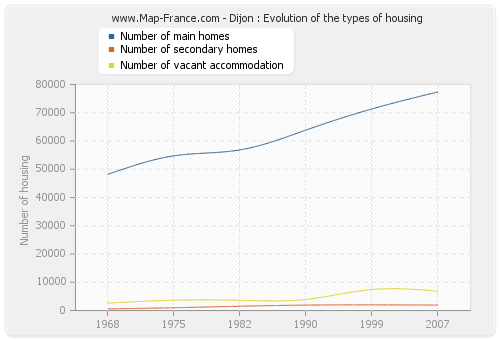 The number of housing of Dijon was 86 160 in 2007, 80 755 in 1999, 69 717 in 1990, 61 976 in 1982, 59 413 in 1975 and 51 463 in 1968.