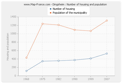 The population of Dingsheim was 1 315 inhabitants in 2007, 1 067 inhabitants in 1999, 1 093 inhabitants in 1990, 1 210 inhabitants in 1982, 1 238 inhabitants in 1975 and 430 inhabitants in 1968. Meanwhile, the number of housing of Dingsheim was 530 in 2007, 412 in 1999, 374 in 1990, 358 in 1982, 348 in 1975 and 116 in 1968.