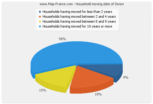 - Number of households of Divion having moved between 2 and 5 years : 493 - Number of households of Divion having moved between 5 and 9 years : 402 - Number of households of Divion having moved for 10 years or more : 1 573 |