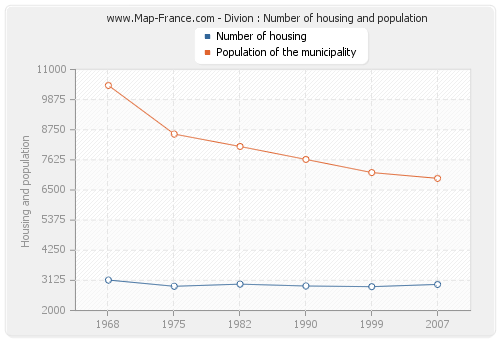 The population of Divion was 6 935 inhabitants in 2007, 7 152 inhabitants in 1999, 7 642 inhabitants in 1990, 8 125 inhabitants in 1982, 8 588 inhabitants in 1975 and 10 407 inhabitants in 1968. Meanwhile, the number of housing of Divion was 2 974 in 2007, 2 890 in 1999, 2 915 in 1990, 2 984 in 1982, 2 904 in 1975 and 3 137 in 1968.
