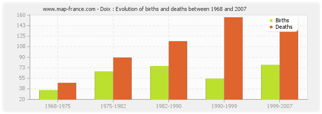 Population of Doix was 808 inhabitants in 2007, 793 inhabitants in 1999, 813 inhabitants in 1990, 764 inhabitants in 1982, 582 inhabitants in 1975 and 590 inhabitants in 1968.