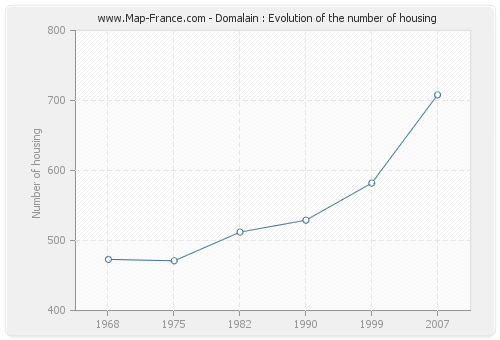 The number of housing of Domalain was 708 in 2007, 582 in 1999, 529 in 1990, 512 in 1982, 471 in 1975 and 473 in 1968.