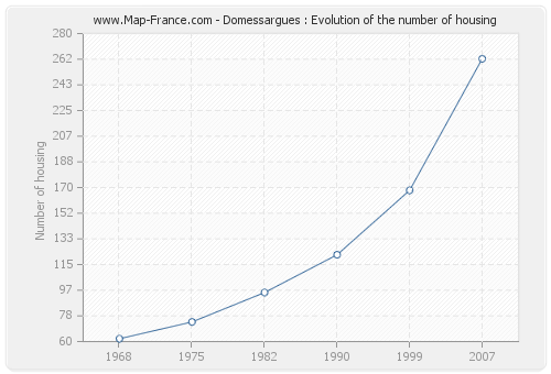 The number of housing of Domessargues was 262 in 2007, 168 in 1999, 122 in 1990, 95 in 1982, 74 in 1975 and 62 in 1968.