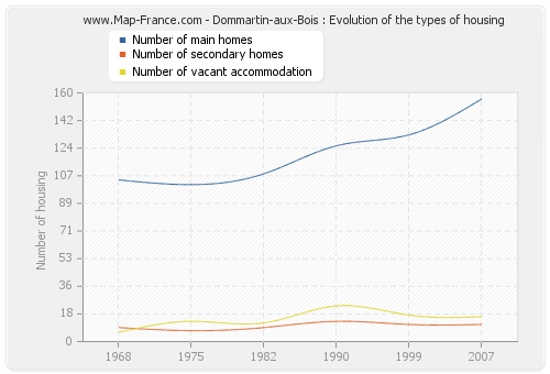 The following graphs show the history of the number and the type of housing of Dommartin-aux-Bois from 1968 to 2007. The second graph is drawn in cubic interpolation. This allows to obtain more exactly the number of accommodation of the town of Dommartin-aux-Bois years where no inventory was made.