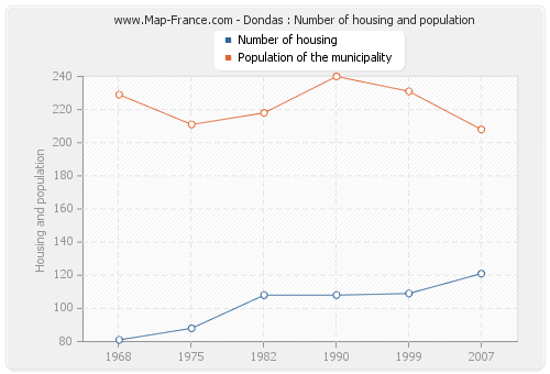 The population of Dondas was 208 inhabitants in 2007, 231 inhabitants in 1999, 240 inhabitants in 1990, 218 inhabitants in 1982, 211 inhabitants in 1975 and 229 inhabitants in 1968. Meanwhile, the number of housing of Dondas was 121 in 2007, 109 in 1999, 108 in 1990, 108 in 1982, 88 in 1975 and 81 in 1968.