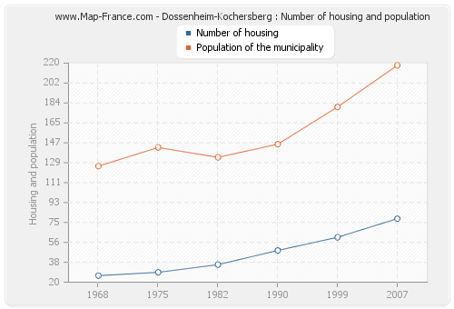 The population of Dossenheim-Kochersberg was 218 inhabitants in 2007, 180 inhabitants in 1999, 146 inhabitants in 1990, 134 inhabitants in 1982, 143 inhabitants in 1975 and 126 inhabitants in 1968. Meanwhile, the number of housing of Dossenheim-Kochersberg was 78 in 2007, 61 in 1999, 49 in 1990, 36 in 1982, 29 in 1975 and 26 in 1968.
