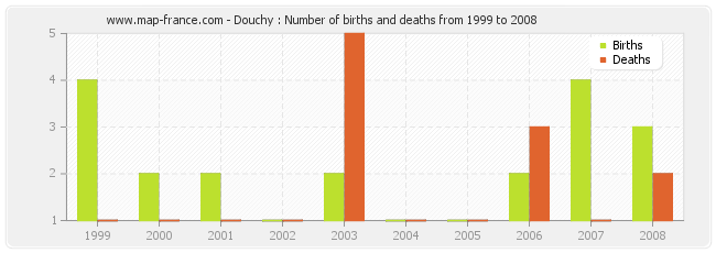 Population of Douchy was 143 inhabitants in 2007, 150 inhabitants in 1999, 152 inhabitants in 1990, 147 inhabitants in 1982, 184 inhabitants in 1975 and 193 inhabitants in 1968.