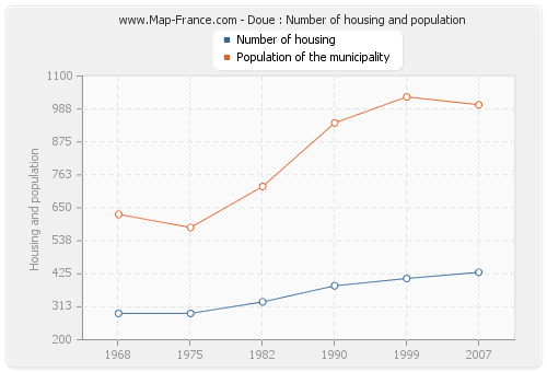 The population of Doue was 1 002 inhabitants in 2007, 1 029 inhabitants in 1999, 940 inhabitants in 1990, 723 inhabitants in 1982, 583 inhabitants in 1975 and 628 inhabitants in 1968. Meanwhile, the number of housing of Doue was 430 in 2007, 409 in 1999, 384 in 1990, 329 in 1982, 290 in 1975 and 290 in 1968.
