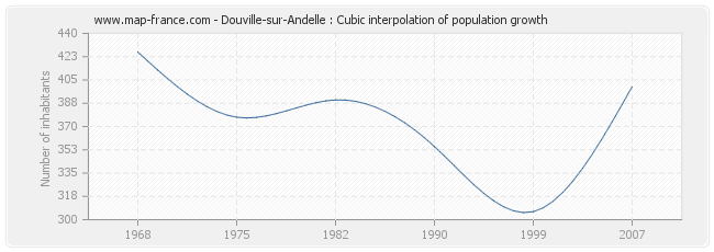 This curve shows the history of the population of Douville-sur-Andelle from 1968 to 2007 in cubic interpolation. This provides more precisely the population of the municipality of Douville-sur-Andelle the years where no census has been taken.