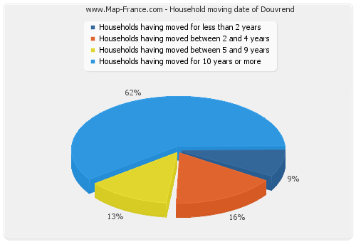 - Number of households of Douvrend having moved between 2 and 5 years : 30 - Number of households of Douvrend having moved between 5 and 9 years : 24 - Number of households of Douvrend having moved for 10 years or more : 112 |
