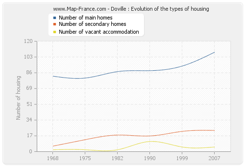 In 2007 the accommodations of Doville consisted of 108 main homes, 23 second homes and 5 vacant accommodations.