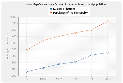 The population of Dozulé was 1 868 inhabitants in 2007, 1 611 inhabitants in 1999, 1 515 inhabitants in 1990, 1 407 inhabitants in 1982, 1 279 inhabitants in 1975 and 984 inhabitants in 1968. Meanwhile, the number of housing of Dozulé was 911 in 2007, 832 in 1999, 623 in 1990, 555 in 1982, 442 in 1975 and 326 in 1968.