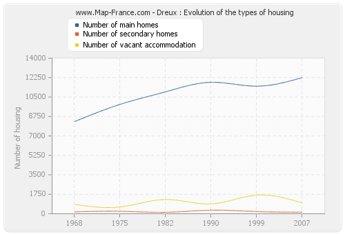 The number of housing of Dreux was 13 351 in 2007, 13 346 in 1999, 13 024 in 1990, 12 380 in 1982, 10 670 in 1975 and 9 301 in 1968.