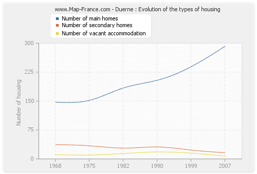 The following graphs show the history of the number and the type of housing of Duerne from 1968 to 2007. The second graph is drawn in cubic interpolation. This allows to obtain more exactly the number of accommodation of the town of Duerne years where no inventory was made.