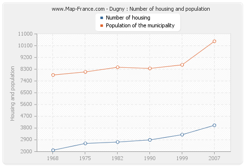 The population of Dugny was 10 439 inhabitants in 2007, 8 635 inhabitants in 1999, 8 361 inhabitants in 1990, 8 451 inhabitants in 1982, 8 094 inhabitants in 1975 and 7 860 inhabitants in 1968. Meanwhile, the number of housing of Dugny was 4 011 in 2007, 3 295 in 1999, 2 895 in 1990, 2 730 in 1982, 2 625 in 1975 and 2 107 in 1968.