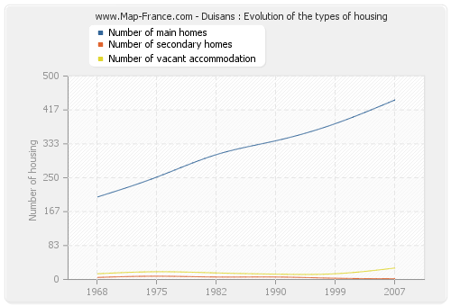 The number of housing of Duisans was 471 in 2007, 400 in 1999, 360 in 1990, 329 in 1982, 279 in 1975 and 222 in 1968.