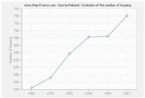 The number of housing of Dun-le-Palestel was 741 in 2007, 685 in 1999, 683 in 1990, 638 in 1982, 572 in 1975 and 544 in 1968.