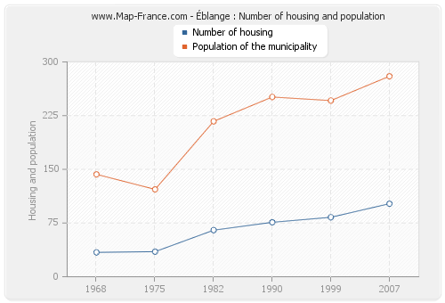 The population of Éblange was 280 inhabitants in 2007, 246 inhabitants in 1999, 251 inhabitants in 1990, 217 inhabitants in 1982, 122 inhabitants in 1975 and 143 inhabitants in 1968. Meanwhile, the number of housing of Éblange was 102 in 2007, 83 in 1999, 76 in 1990, 65 in 1982, 35 in 1975 and 34 in 1968.