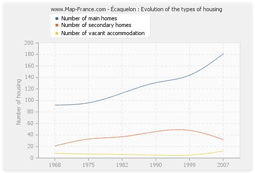 The following graphs show the history of the number and the type of housing of Écaquelon from 1968 to 2007. The second graph is drawn in cubic interpolation. This allows to obtain more exactly the number of accommodation of the town of Écaquelon years where no inventory was made.