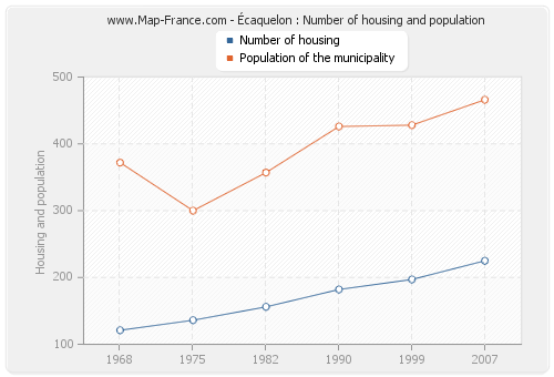 The population of Écaquelon was 466 inhabitants in 2007, 428 inhabitants in 1999, 426 inhabitants in 1990, 357 inhabitants in 1982, 300 inhabitants in 1975 and 372 inhabitants in 1968. Meanwhile, the number of housing of Écaquelon was 225 in 2007, 197 in 1999, 182 in 1990, 156 in 1982, 136 in 1975 and 121 in 1968.