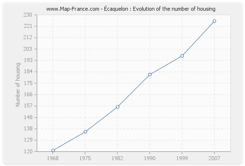 The number of housing of Écaquelon was 225 in 2007, 197 in 1999, 182 in 1990, 156 in 1982, 136 in 1975 and 121 in 1968.