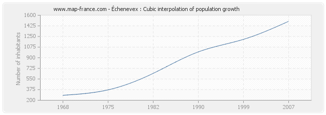 This curve shows the history of the population of Échenevex from 1968 to 2007 in cubic interpolation. This provides more precisely the population of the municipality of Échenevex the years where no census has been taken.
