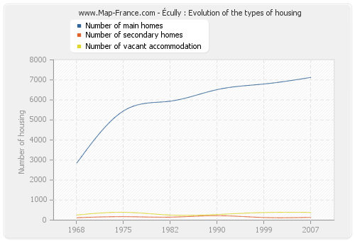 The following graphs show the history of the number and the type of housing of Écully from 1968 to 2007. The second graph is drawn in cubic interpolation. This allows to obtain more exactly the number of accommodation of the city of Écully years where no inventory was made.
