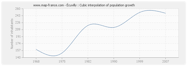 Population of Écuvilly was 249 inhabitants in 2007, 251 inhabitants in 1999, 214 inhabitants in 1990, 219 inhabitants in 1982, 151 inhabitants in 1975 and 160 inhabitants in 1968.