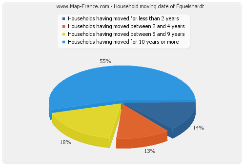 - Number of households of Éguelshardt having moved between 2 and 5 years : 19 - Number of households of Éguelshardt having moved between 5 and 9 years : 28 - Number of households of Éguelshardt having moved for 10 years or more : 84 |