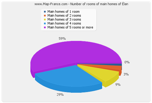 - Number of main homes of Élan of 1 room : 0 - Number of main homes of Élan of 2 rooms : 1 - Number of main homes of Élan of 3 rooms : 3 - Number of main homes of Élan of 4 rooms : 3 - Number of main homes of Élan of 5 rooms and more : 20 |