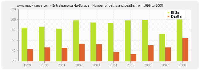 Entraigues-sur-la-Sorgue : births and deaths from 1999 to 2008