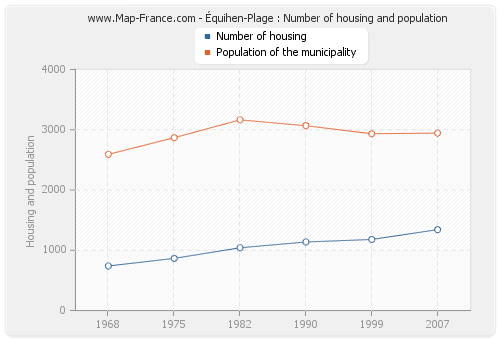 The population of Équihen-Plage was 2 944 inhabitants in 2007, 2 934 inhabitants in 1999, 3 067 inhabitants in 1990, 3 164 inhabitants in 1982, 2 868 inhabitants in 1975 and 2 592 inhabitants in 1968. Meanwhile, the number of housing of Équihen-Plage was 1 342 in 2007, 1 179 in 1999, 1 137 in 1990, 1 041 in 1982, 865 in 1975 and 739 in 1968.