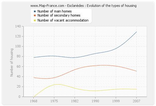 The following graphs show the history of the number and the type of housing of Esclanèdes from 1968 to 2007. The second graph is drawn in cubic interpolation. This allows to obtain more exactly the number of accommodation of the town of Esclanèdes years where no inventory was made.
