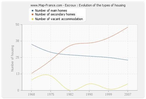 The number of housing of Escroux was 76 in 2007, 66 in 1999, 67 in 1990, 61 in 1982, 63 in 1975 and 56 in 1968.