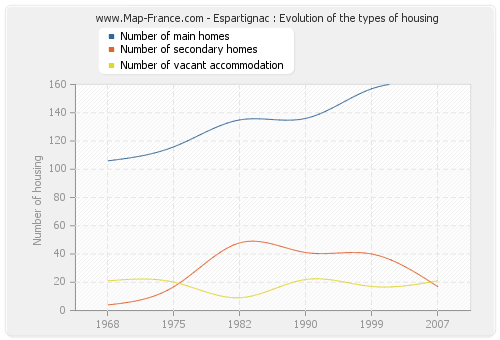 The following graphs show the history of the number and the type of housing of Espartignac from 1968 to 2007. The second graph is drawn in cubic interpolation. This allows to obtain more exactly the number of accommodation of the town of Espartignac years where no inventory was made.