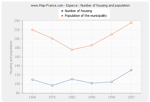The population of Esperce was 236 inhabitants in 2007, 210 inhabitants in 1999, 186 inhabitants in 1990, 176 inhabitants in 1982, 201 inhabitants in 1975 and 220 inhabitants in 1968. Meanwhile, the number of housing of Esperce was 131 in 2007, 105 in 1999, 102 in 1990, 111 in 1982, 97 in 1975 and 110 in 1968.
