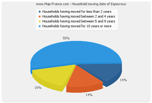 - Number of households of Espeyroux having moved between 2 and 5 years : 7 - Number of households of Espeyroux having moved between 5 and 9 years : 8 - Number of households of Espeyroux having moved for 10 years or more : 27 |