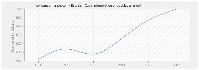 Population of Esprels was 700 inhabitants in 2007, 675 inhabitants in 1999, 631 inhabitants in 1990, 596 inhabitants in 1982, 608 inhabitants in 1975 and 584 inhabitants in 1968.