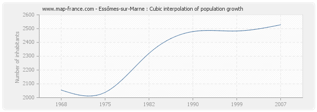 This curve shows the history of the population of Essômes-sur-Marne from 1968 to 2007 in cubic interpolation. This provides more precisely the population of the municipality of Essômes-sur-Marne the years where no census has been taken.