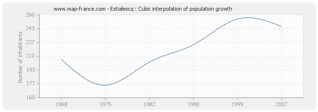 This curve shows the history of the population of Estialescq from 1968 to 2007 in cubic interpolation. This provides more precisely the population of the municipality of Estialescq the years where no census has been taken.