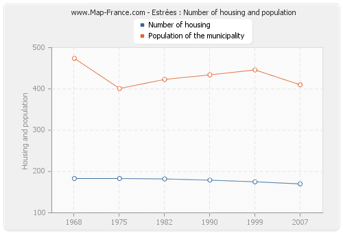 The population of Estrées was 410 inhabitants in 2007, 446 inhabitants in 1999, 434 inhabitants in 1990, 423 inhabitants in 1982, 401 inhabitants in 1975 and 474 inhabitants in 1968. Meanwhile, the number of housing of Estrées was 170 in 2007, 175 in 1999, 179 in 1990, 182 in 1982, 183 in 1975 and 183 in 1968.