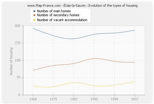 The following graphs show the history of the number and the type of housing of Étais-la-Sauvin from 1968 to 2007. The second graph is drawn in cubic interpolation. This allows to obtain more exactly the number of accommodation of the town of Étais-la-Sauvin years where no inventory was made.