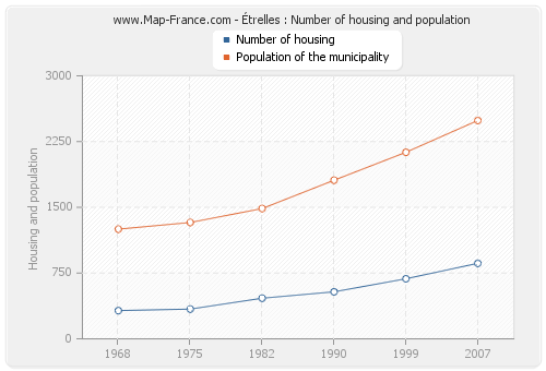 The population of Étrelles was 2 491 inhabitants in 2007, 2 128 inhabitants in 1999, 1 809 inhabitants in 1990, 1 486 inhabitants in 1982, 1 327 inhabitants in 1975 and 1 251 inhabitants in 1968. Meanwhile, the number of housing of Étrelles was 861 in 2007, 685 in 1999, 536 in 1990, 463 in 1982, 339 in 1975 and 322 in 1968.