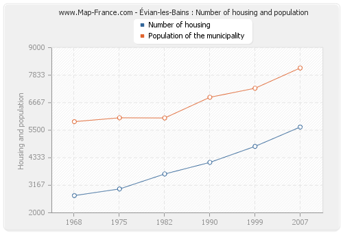 The population of Évian-les-Bains was 8 137 inhabitants in 2007, 7 278 inhabitants in 1999, 6 895 inhabitants in 1990, 6 018 inhabitants in 1982, 6 026 inhabitants in 1975 and 5 863 inhabitants in 1968. Meanwhile, the number of housing of Évian-les-Bains was 5 634 in 2007, 4 814 in 1999, 4 135 in 1990, 3 644 in 1982, 3 010 in 1975 and 2 729 in 1968.