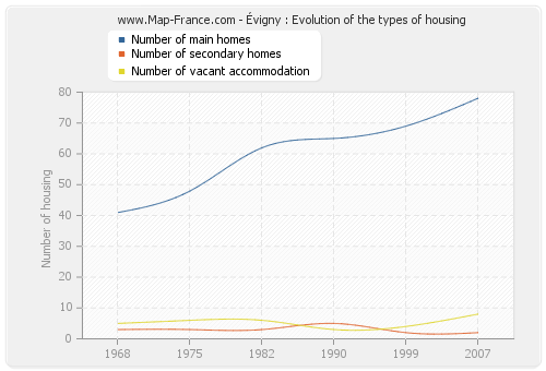 The number of housing of Évigny was 87 in 2007, 75 in 1999, 73 in 1990, 71 in 1982, 57 in 1975 and 49 in 1968.