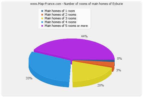 - Number of main homes of Eyburie of 1 room : 0 - Number of main homes of Eyburie of 2 rooms : 7 - Number of main homes of Eyburie of 3 rooms : 43 - Number of main homes of Eyburie of 4 rooms : 43 - Number of main homes of Eyburie of 5 rooms and more : 95 |